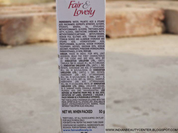 Fair And Lovely Cream Ingredients - Water, palmitic acid and stearic acid, niacinamide, glycerin, cetearyl ethylhexanoate and isopropyl myristate, ethylhexyl methoxycinnamate, butylmethoxydibenzoylmethane, hydroxystearic acid, sodium ascorbyl phosphate, tocopheryl acetate.